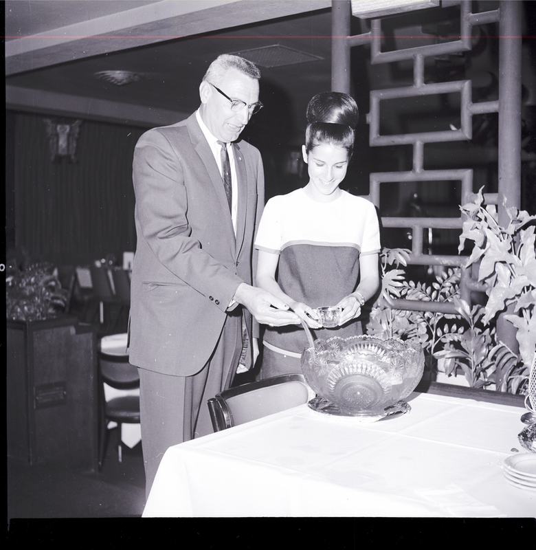 H. E. Cheney serves punch to Murray Clements at a social for Magic Valley Baseball Queen candidates held at Kay's Supper Club in Twin Falls. Miss Clements is sponsored by the Twin Falls Elks Lodge. Mr. Cheney is wearing a suit and tie and Miss Clements is wearing a dress. On the table in front of them is a crystal punch bowl and an arrangement of flowers. Behind them is a lattice and some plants. A dining room is in the background.