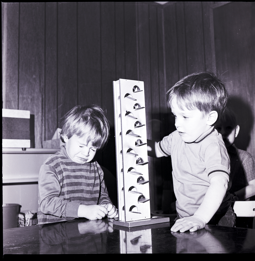 From left to right, Miles Clinton, caught mid-sneeze, and Randy Silvey play with a musical education device at Children's Village, a Montessorian method pre-school in Twin Falls run by Mrs. Charles Hopkins. Another student is in the background. A shelf with a box of tissues on it is against the back wall.