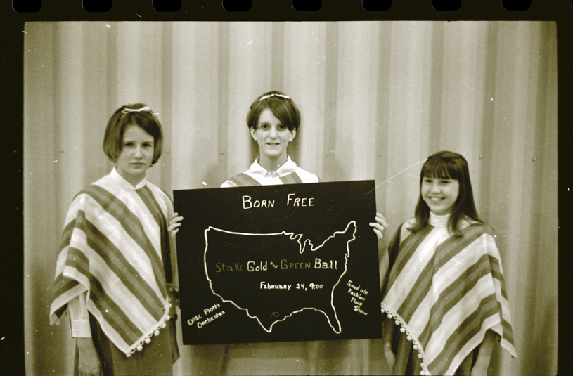 From left to right, Willa Bishop, Karla Barrus, and Evonne Halladay hold up a poster announcing an old-fashioned floor show to be held at the LDS Stakehouse. The girls are dressed in striped ponchos. The poster has an outline of the United States on it, and reads "Born Free, Stake Gold and Green Ball, February 24th, 9:00. Dale Plott's Orchestra. Good ole fashion floor show."