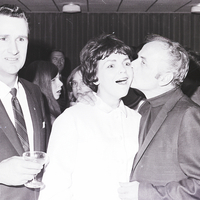 H. Paul Kliss, director of the show, kisses Mrs. David Mead, lead actress, on the side of the cheek at the Dilettante's "Sound of Music" opening night champagne dinner, held prior to the show at the Twin Falls Holiday Inn. Roger Vincent, lead actor, stands beside them, holding a glass of champagne. Other attendees visit with each other in the background.