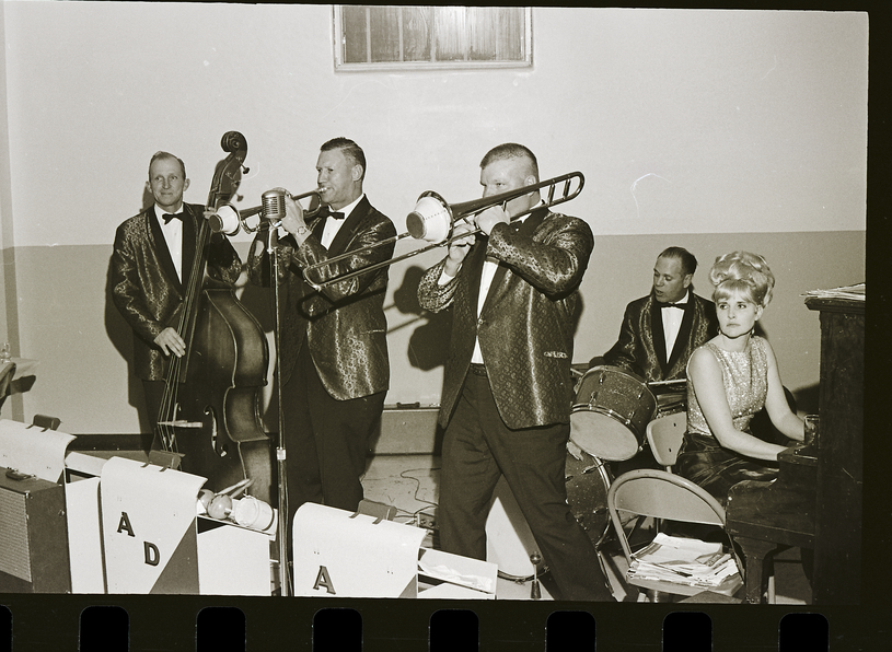A band provides music at a fundraising party sponsored by Beta Sigma Phi and held at the Buhl National Guard Armory. The four men in the band, dressed in suits and bow ties, play the bass, trumpet, trombone, and drums. A woman dressed in an evening gown plays the piano. A microphone and sound equipment are set up around the musicians.