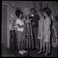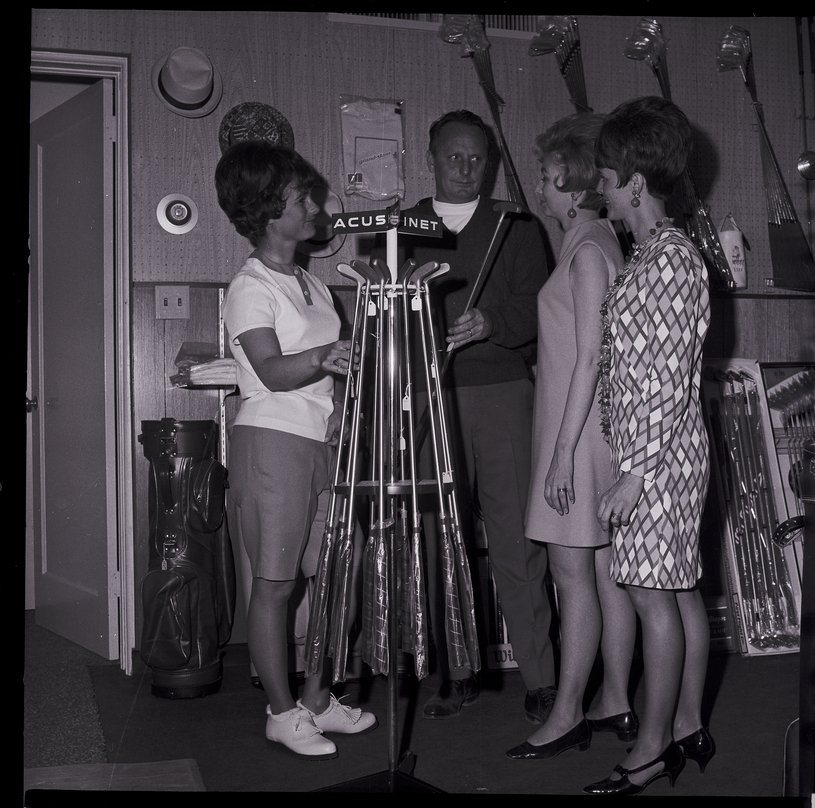 Three women visit with a man in a golf supply store, looking at a wrack of putters. The three women are busy with preparations for the Twin Falls Ladies Municipal Golf Association Fashion Show, to be held at Kay's Supper Club. The fashions will be supplied from The Paris, Roper Clothing Store, Anne's Casuals, and Clyde's Pro Shop. The woman on the right is dressed in a polo shirt and shirts, while the two women on the right are wearing dresses and heels. Several golf clubs and golfing hats hang on the back wall, and a golf club case leans against the wall.