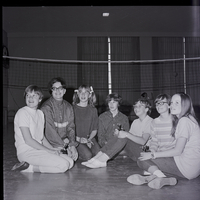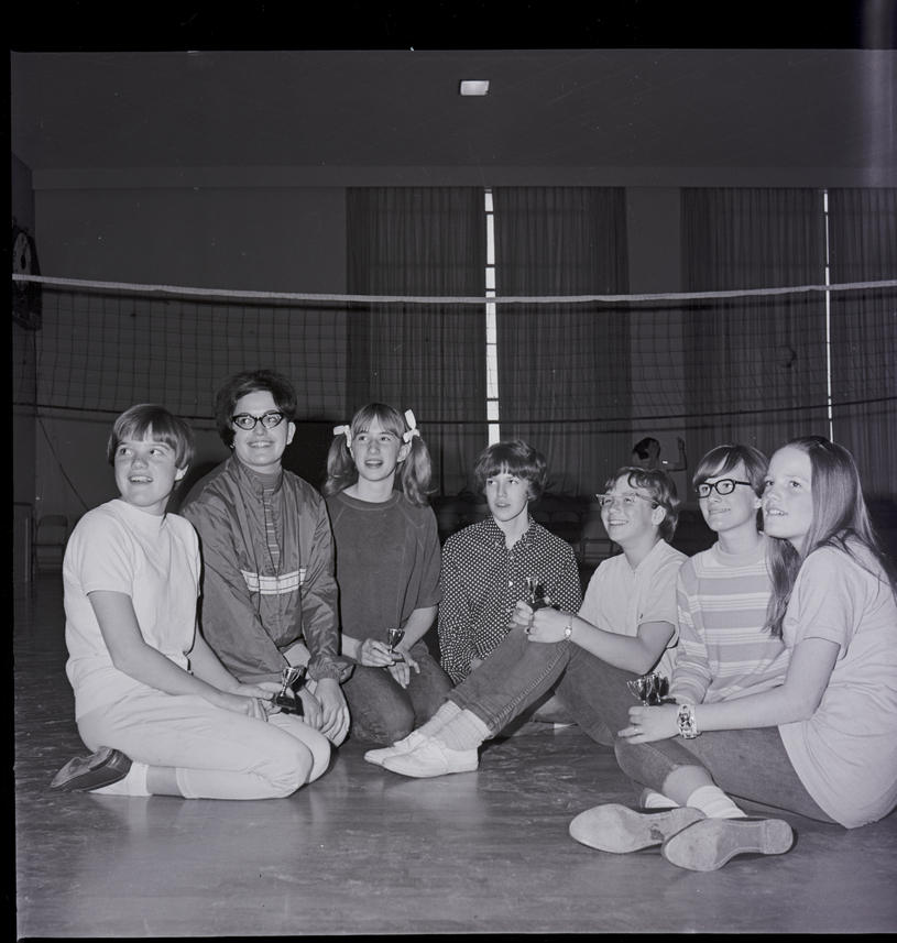 Members of the winning Stake Volleyball Tournament Beehive team of the junior division were from the third LDS ward and included, from left to right, Jan Bartlett, Karen Smith, coach, Leslie Hamilton, Lynette Smith, Debbie Tennant, Terry Latham, and Dea Bartlett. The girls sit on the ground in front of a volleyball net, holding their trophies.