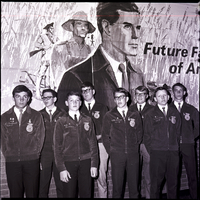 Twin Falls FFA chapter adviser and officers gather at the Parent-Son Banquet. In attendance are Archie Quesnell, Bob Hamilton, and Mike Sommer. A banner hangs on the wall behind them reading "Future Farmers of America" that has an illustrated of a mountain man, a farmer, and a businessman on it.