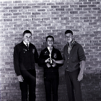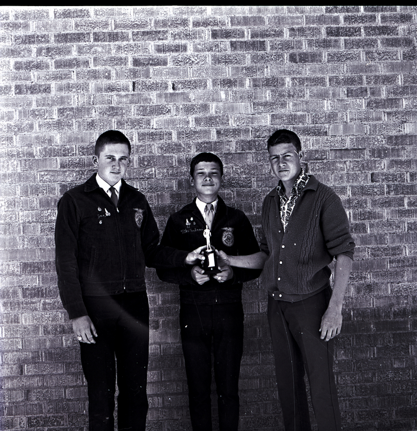 - Three winners in the FFA Poultry Contest from the Valley chapter display their award trophy. Two of the boys are wearing their FFA jackets, and the third is wearing a sweater. They are standing against a brick wall.