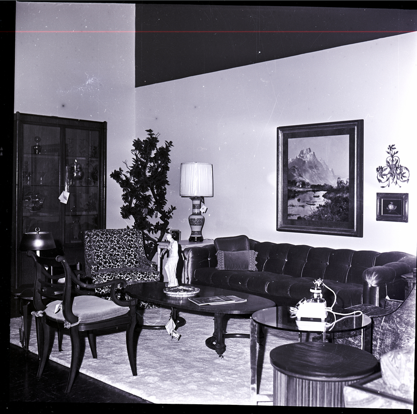 A display of furniture is seen inside of L'Herisson's furniture store during its grand opening. In the display is a couch, several chairs, a round wooden table, a round glass table with a telephone on it, a coffee table with a statue, decorative plate, and magazines on it, and a side table with a picture frame and lamp on it. Against the back wall is a cabinet with glass doors with various home decorations inside it. A plant sits in the corner, and a painting and some wall ornaments hang over the couch.