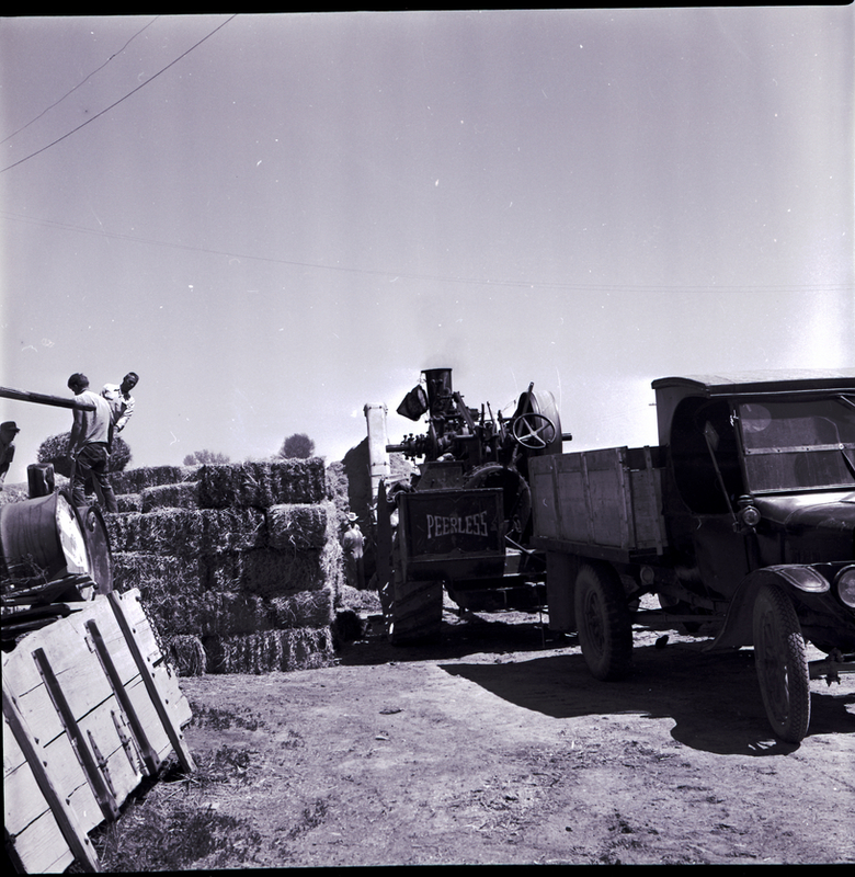 Ed Vogel visits with another farmer in front of an eight-ton steam engine used to run a hay chopper. The word "Peerless" is written across the back of the steam engine. A stack of hay bales is piled to the side, and two farmers stand on top of the pile, moving the hay bales. A truck is parked behind the steam engine.