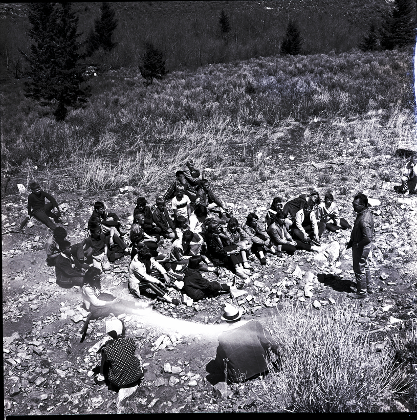 A man speaks to a group of Minidoka and Cassia County sixth graders about soils on a conservation tour of Howell Canyon. The children sit on the ground listening to the man, and two other adults sit on the sidelines. Rocks and wild grass cover the area. In the background are several small pine trees dotting the view.