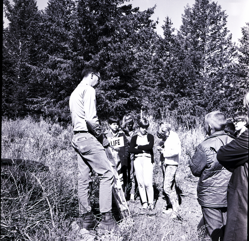 - A man talks to a group of Minidoka and Cassia County sixth graders about wildlife during a conservation tour of Howell Canyon. He stands beside a sign that reads "Wildlife" as a group of children stand around him, listening. Trees and wild grass surround the area.
