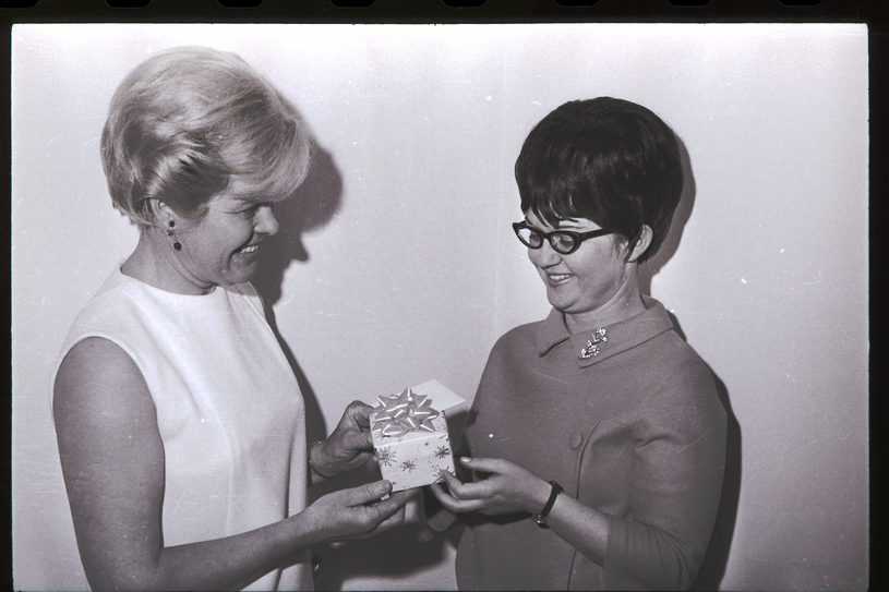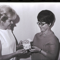 Alpha Nu chapter members Mrs. Maurice Fuller, right, presents Mrs. Mark Wilkie a small wrapped present as a "Girl of the Year" award during the Epsilon Sigma Alpha Founder's Day celebration.