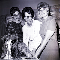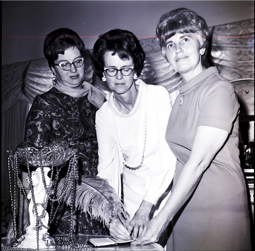 Signing a guild book with a large feather pen as new president of the Belle Lettres Literary Guild is Mrs. Joseph Van Leeuwen, center. Mrs. Dale G. Child, left, is past president, and Mrs. John S. Campbell, right, is vice president and president-elect. On the table is a figurine holding a glass dish filled with ornaments and strings of beads. Behind them is a curtained window.
