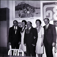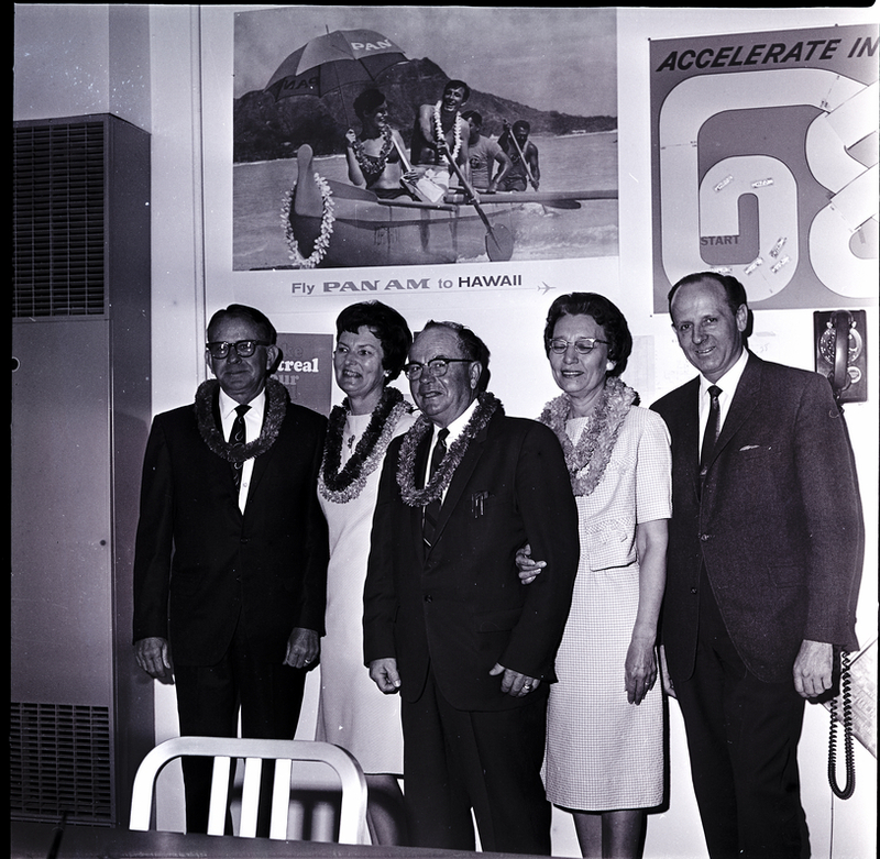 Prudential Insurance Company agents who won a trip to Hawaii for their sales achievements stand against a wall under a poster of some canoeists wearing leis that reads "Fly Pan Am to Hawaii." From left to right are Mr. and Mrs. Leo Barry and Mr. and Mrs. Kenneth Nesbitt, and Webb Malone. The women are wearing dresses and the men are wearing suits and ties, and they have leis around their necks. A table and chair are in front of them. A poster of a race track and a telephone hang on the back wall.