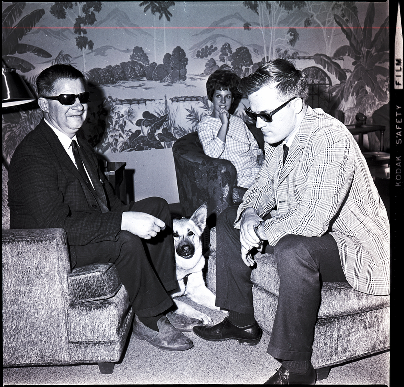Jay Hill, left, sits on a recliner and Bob Caron, right, sits on a footrest at a party for students of the Idaho State Deaf and Blind School, held at the home of Mrs. E. W. McRoberts and hosted by the Twin Falls Delta Gamma Alumnae Association. Bob Caron is an instructor at the school. The two blind men are dressed in suits and ties and sunglasses. A German Shepherd lies on the ground beside them. A woman sits in a recliner at the back of the room. The back wall is decorated with a wallpaper covered in plants, trees, and mountains.