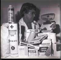 KEL 978 Mrs. Jean Thompson, superintendent of the first aid station at the Twin Falls County Fair, takes an inventory of medical supplies. She is checking off items on a clipboard, and wearing a shirt with a badge that reads "Emergency First Aid." She is surrounded by containers of gauze, band-aids, medical tape, and skin disinfectant.