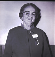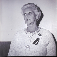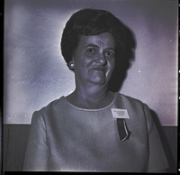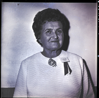 KEL 985 003 Mrs. Orville Sackett, superintendent of youth for the Twin Falls County Fair, stands beside a wall. She is wearing a floral-print blouse with a name tag pinned onto the front.