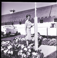 KEL 983 Mrs. Tom Shouse leans against a flag pole at the Twin Falls County Fairgrounds. Bright patches of flowers surround the flag pole. A building and some parked pick-up trucks are visible behind her.