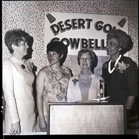 KEL 782 Special guests and members of the Desert Gold Cowbelles stand behind a podium at a luncheon held at the Rogerson Hotel in Twin Falls. From left to right are Mrs. Russell Larsen, American National Cowbelle president; Mrs. Robert Stringfellow, American National CowBelle secretary; Mrs. Tom Sharp, Desert Gold Cowbelles president; and Mrs. Larry Heil, Desert Gold Cowbelles, local treasurer. On the wall behind them is a sign that reads "Desert Gold Cowbelles."