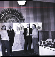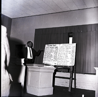 KEL 779 John Pastoor, chairman of the Twin Falls Soil Conservation District's snow survey committee, stands on a stage and goes over some charts on the water forecast for the 1968 irrigation season on the Salmon and Roseworth Tracts during a water forecast meeting held in Hollister. One chart is titled "Salmon Tract Water Forecast - 1968" and the other chart is titled "Roseworth Water Forecast 1968."