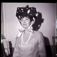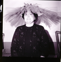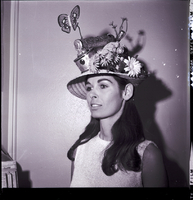 KEL 783 Carol Serpa wears a wide-brimmed hat covered in plastic flowers, a crown, a kaleidoscope, and a butterfly. The hat was homemade for Easter and worn during the Ladies of the Elks hat parade.