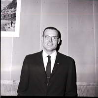 KEL 781 Lewis Pence, new Soil Conservation Service aide in Buhl, stands in an office. He is dressed in a suit and tie. An image of a hiker standing on a river bank down in a canyon hangs on the back wall.