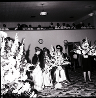 KEL 663 Three queens for Job's Daughters, dressed in their uniforms, stand behind a large arrangement of flowers during the Reception of the Flowers at the 99th annual Communication of the Grand Lodge of Idaho, held at the Twin Falls Masonic Temple. The center girl is Connie Van Ostran. To the left a man is seen behind a large floral display, and two the right women in black dresses hold bouquets. Attendees are seen seated around the sides of the room and up on the mezzanine.