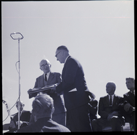 KEL 655 Ellis Mathes, state highway engineer, presents Dan Cavanagh, pioneer builder and contractor for the suspension bridge, with a scrapbook containing information about both Hansen bridges during the Hansen Bridge Dedication. They are dressed in suits and ties. Several other men are seated in folding chairs on the stage, watching. A microphone stand is to the side.