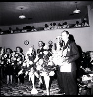 KEL 662 A group of men and women stand behind large stands of flowers or hold bouquets in their hands during the Reception of the Flowers at the 99th annual Communication of the Grand Lodge of Idaho, held at the Twin Falls Masonic Temple. The men, from left to right, are Jack Waegelin, Twin Falls Shrine Club; Floyd Bandy, Twin Falls Chapter of the Royal