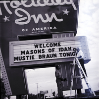 KEL 661 Two men put letters up on the sign out front of the Holiday Inn of America hotel. The sign reads "Welcome Masons of Idaho. Mustie Braun Tonight." One man is on a step ladder, holding the letter "O" and situating it at the end of the word "Idaho" while the other man stands below the ladder.