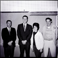 KEL 545 College of Southern Idaho student senate officers are, from left to right, Charles Alban, adviser and political science instructor, Ronald Hansen, student body president, Barbara Fredrickson, secretary-treasurer, and Bill Waddell, senate chairman. Mr. Alban and Mr. Hansen are dressed in suits and ties. Ms. Frederickson is wearing a shirt, pants, and white sweater. Mr. Waddel is dressed in a button-up shirt with pens in the front pocket, pants, and an embroidered sweater with a horse and lasso on it. They are standing in front of a blackboard.
