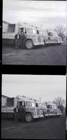 KEL 540 Harry Knigge, sanitation company foreman, and Chad Thompson, city sanitation inspector, stand beside new garbage trucks owned by the Eldon Corporation. A house and a tree are seen in the background.