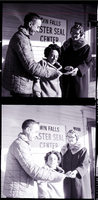 KEL 542 Robert Meuleman, Easter Seal Center bus driver, presents a check for $175 donated by the Union Pacific Old Timers Club to Mrs. E. P. Messner, Easter Seal Center worker, while Karleena Hills watches. Behind them the Twin Falls Easter Seal Center is visible. They are all dressed in thick winter coats.