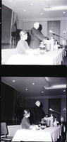 KEL 539 United States Senator Len Jordan speaks at a joint meeting of the Twin Falls County Republican Women and Petticoat Pollys held at the American Legion Hall in Twin Falls. He is dressed in a suit and tie and stands behind a podium. A woman is seated at the table beside him, and cups, a coffee pot, ash trays, a pitcher, and an elephant decoration are on the table. A man is sitting at the side of the room. On the stage behind them is a piano and some flags.