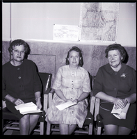 KEL 535 Mrs. A. B. Paris, Mrs. Juanita Kinney, and Mrs. Laura Holman are winners in the Thanksgiving drawing sponsored by Twin Falls downtown merchants. Mrs. Paris won first prize of $100 worth of merchandise, Mrs. Kinney won $50 worth of merchandise, and Mrs. Holman won $25 worth of merchandise. The three women are wearing dresses, and they are seated and are holding their award certificates in their laps. A map of Idaho is on the wall behind them.
