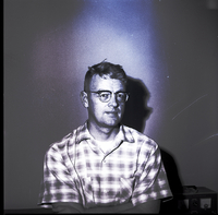 KEL 543 Snake River Conservation Center research scientist Dr. J. W. Cary published a paper relating soil moisture transfer to temperature fluctuations which was presented to the American Society of Agronomy. He is standing against a wall and wearing a plaid button-up shirt. A power box is against the wall behind him.
