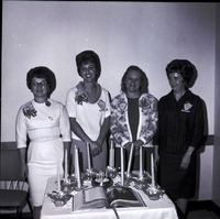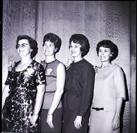 KEL 537 Officers for the new District No. 3 Epsilon Sigma Alpha sorority pose against a wall. From left to right are Mrs. Joe Hinz, treasurer; Mrs. Keith Uscola, vice president; Mrs. Arthur I. Ball, state president; and Mrs. Clifton Peterson, president. They are wearing dresses, corsages, and name tags.