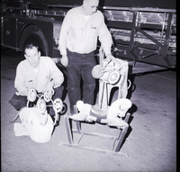 KEL 546 Repairing broken toys to be given for Christmas to underprivileged children are TFFD firemen James Miller, left, and Herman Carlton. Mr. Miller works on repairing a baby carriage, while Mr. Carlton works on repairing a toy car. A rocking horse is in front of them. A fire engine is in seen in the background.