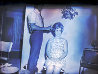 KEL 497 Gail Burkinshaw, representative for Sherwood Wig Co. of Salt Lake City, styles a wig for Mrs. Sue Hoffman. He is wearing a striped shirt, tie, and slacks, and she is wearing a sleeveless floral print dress. Some round boxes holding other wigs and hairpieces are on the floor. In the corner of the room is a television. A flower ornament hangs from the wall above them. Another room is seen through a doorway to the left.