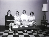 KEL 495 Officers of the Country Woman's Club sit on a couch. From left to right are Mrs. L. V. Nicholson, corresponding secretary; Mrs. Edward Waite, secretary; Mrs L. E. Bird, vice president, and Mrs. Carrie Modlin, president. All the women are wearing dresses. In front of the couch is a table, and on it are a telephone, ash tray, and centerpiece of fruits and flowers. On a stand to the side of the couch is a lamp.