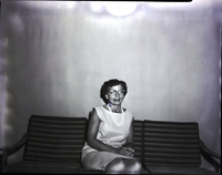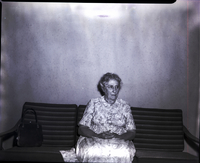 KEL 491 Mrs. Frank Walton, president of the Mary Davis Art Club, sits on a couch. She is wearing a patterned dress. A purse sits beside her on the couch.