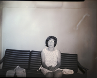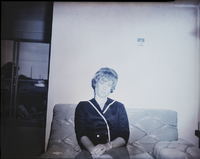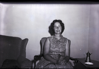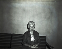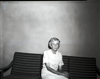 KEL 483 Mrs. Earl Shobe, oracle of the Vishnu Camp No. 2970 of the Twin Falls Royal Neighbors of America, sits on a couch. She is wearing a floral print dress.