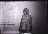 KEL 487 Mrs. Jessie Davis, president of the Salmon Social Club, stands beside a wall. She is wearing a floral print dress. Hanging on the wall beside her is a map of the state of Idaho that reads "Idaho Legislative and County Officials -- 1965-1966."
