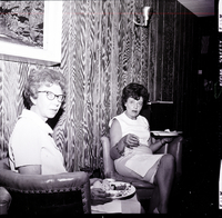 KEL 932 001 Two members of the Twin Falls Democratic Women sit in chairs eating from plates of food at a potluck luncheon held in honor of Mrs. R. L. Summerfield at the home of Tommy Walker. Between them is a round table, and on the table are some coffee cups and a clear goblet filled with water and floating flowers as a centerpiece. On the wall above them are a lamp and a photograph of a canyon wall.
