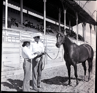 KEL 927 The top Arabian mare, Carinosa, owned by Dr. and Mrs. B. P. Husband, stands in a corral at the Idaho All-Arabian Horse Show. From left to right, Gerrie Paladini presents a dish trophy and award ribbon to Jeff Wonnell, the mare's trainer. They are dressed in cowboy hats and boots. To the side of the corral, several people sit on bleachers watching the horse show.