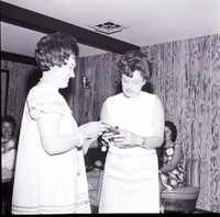 KEL 932 002 The new president of Twin Falls Democratic Women, Mrs. Rose Walker, left, presents an appreciation plaque to Mrs. R. L. Summerfield at a recent potluck luncheon in her honor held at the home of Tommy Walker. The plaque read, "In appreciation to Mrs. R. L. Summerfield, past president of Twin Falls Democratic Women." Several other members of the club sit in chairs around the room watching.
