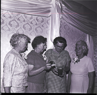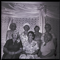 KEL 934 A group of women dressed in dresses and corsages pose at the Canyonside Community Club Golden Anniversary social in Jerome at the Carillon. A drape hangs on the wall behind them.