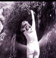 KEL 925 A girl reaches up to pick watercress from a bush growing over the side of a cliff in the Snake River Canyon near Shoshone Falls. Some water escapes down the sides of the cliff. The girl is dressed in a matching sleeveless top and shorts.