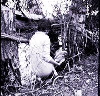 KEL 926 A woman gathers some wild mushrooms near a collapsed tree. Beside her is a barbed wire fence.